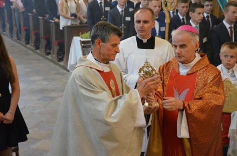 „Jedna tylko pokora, ta nam zapewnia wytrwanie do końca i nagrodę kiedyś w niebie”. Te słowa błogosławionej Klary Szczęsnej znalazły się na obrazku upamiętniającym wprowadzenie jej relikwii do Kościoła pw. Wszystkich Świętych w Brzezinach. Dokonał go bp Marian Florczyk w poniedziałkowe popołudnie, 13 czerwca 2016 r. Tego dnia w Brzezinach również 38 młodych osób przyjęło Sakrament Bierzmowania.