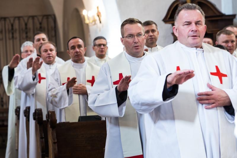Eucharystię koncelebrowali biskupi pomocniczy Marian Florczyk i Andrzej Kaleta oraz blisko 100 księży przybyłych z wszystkich krańców diecezji. – „Diecezjalna pielgrzymka kapłanów ma wymiar bardzo bliskiej relacji do Boga, ale też wymiar integracyjny. Spotykamy się z księżmi z diecezji kieleckiej, co stanowi ogromną siłę dla każdego z nas. To spotkanie to ogromny dar, który może zaowocować spokojem i radością wewnętrzną dla nas wszystkich” – mówił bp Marian Florczyk.